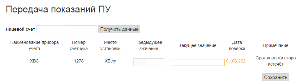 На вкладке передача показаний приборов учёта пользователь вводит свой лицевой счёт и по нажатию на кнопку "Получить данные" происходит загрузка данных о показаниях приборов учёта. Если у прибора истёк срок поверки, то пользователь не сможет внести данные.